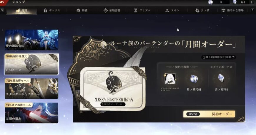スキンやモーションなどの限定アイテム、依頼ドロップ率を上げる「依頼手帳」、ログイン特典が豪華になる「月間オーダー」などが課金要素の中心です。