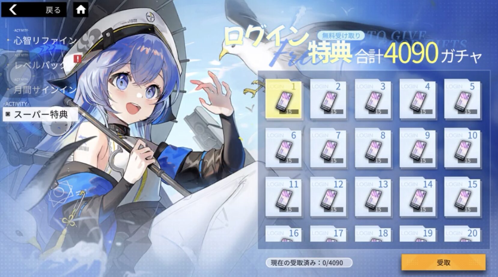 ガチャは毎日15連!最大4090連の超配布