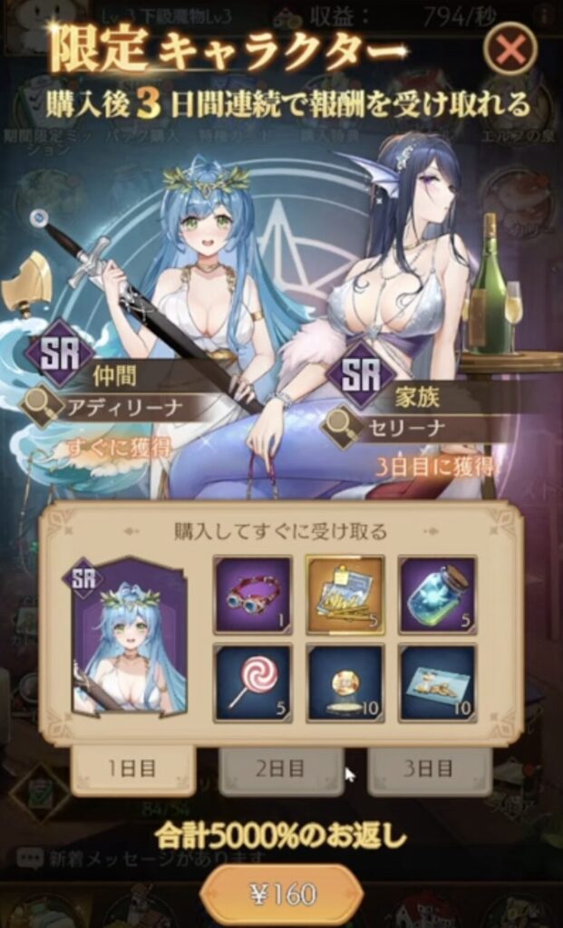 初購入特典は、1円以上の課金で解放され、以下の報酬を3日間に分けて受け取れます。