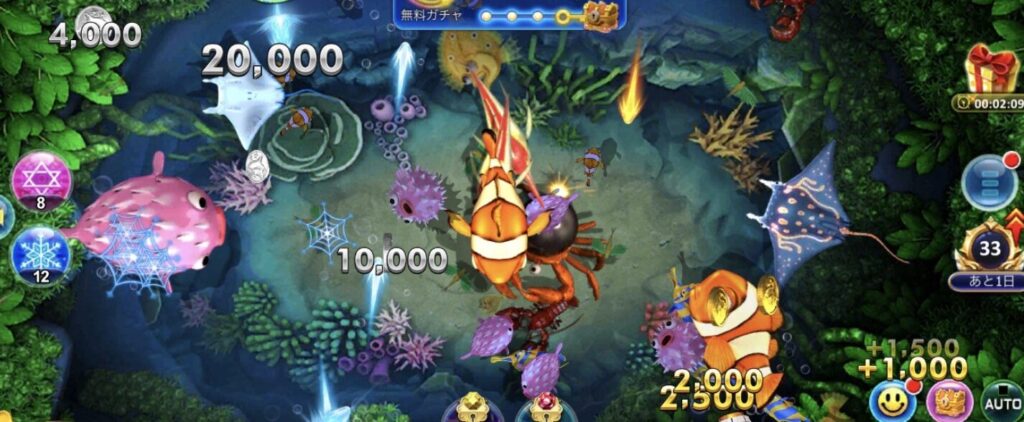 スロットだけでなく、魚を撃ってコインを獲得するフィッシング系ゲームも収録。